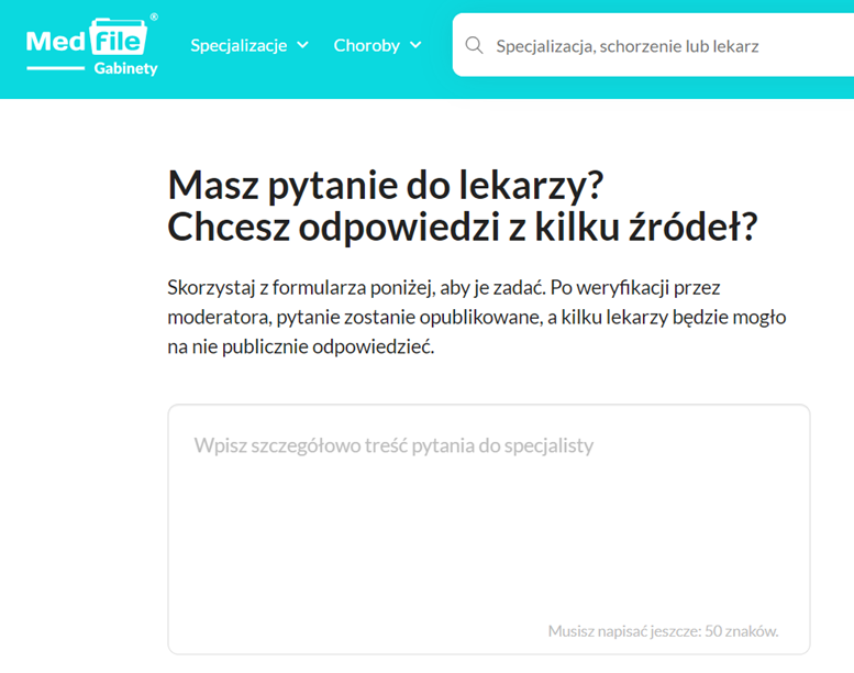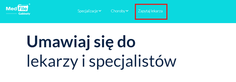 Korzystając ze strony Medfile Gabinety pacjent ma możliwość wysłania zapytania do lekarza bez potrzeby umawiania się na wizytę. Jego pytanie jest anonimowe i otrzyma kilka odpowiedzi od różnych lekarzy. Klikając w zakładkę „Zapytaj lekarza”