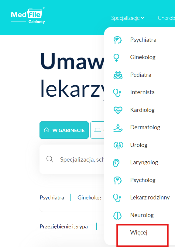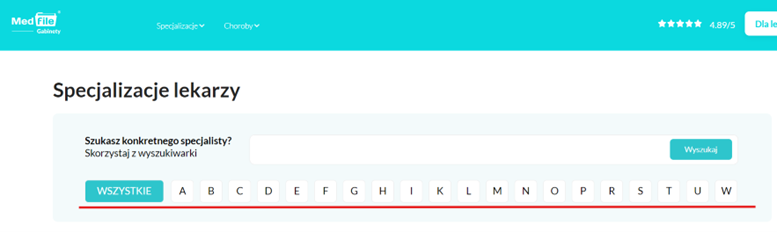 Aby ułatwić pacjentom korzystanie ze strony na górze strony istnieje możliwość wybrania danej specjalizacji poprzez rozwijany pasek.