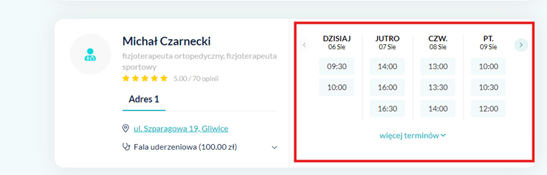 Gdy Pacjent wyszuka już lekarza do którego chce się umówić, ma możliwość wyboru konkretnego dnia i godziny.