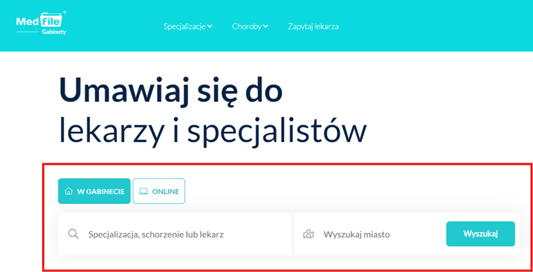 Strona internetowa Medfile Gabinety służy pacjentom do wyszukania potrzebnego specjalisty, lekarza bądź usługi. Można umówić się do lekarza na wizytę stacjonarną lub na wizytę online.