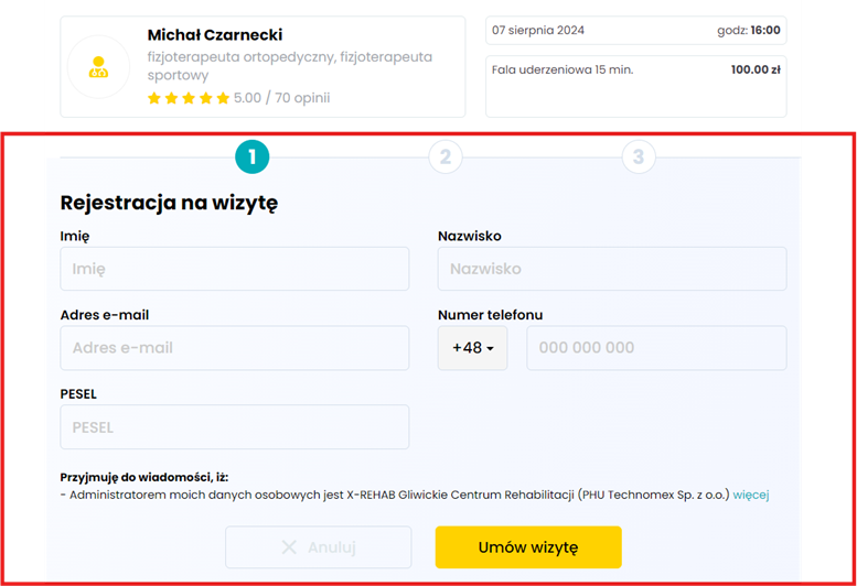 Po wyborze daty i godziny pacjent zostaje automatycznie przekierowany do innej strony gdzie musi uzupełnić swoje dane i akceptować regulamin.