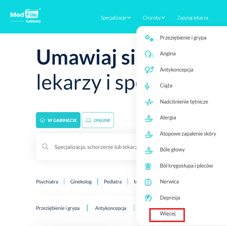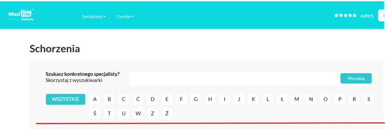 Rozwijając zakładkę choroby, mamy możliwość wyszukania specjalisty po konkretnym schorzeniu.