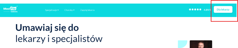 Na stronie Medfile Gabinety lekarze mogą promować swój gabinet oraz udzielać porad medycznych. Klikając w przycisk "Dla lekarzy" otworzy nam się osobne okno przeglądarki